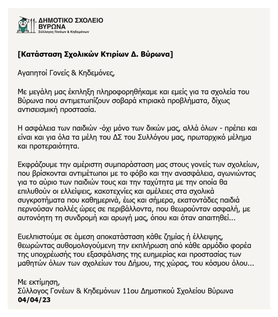 08/05/2023 HappySpot Κατάσταση Σχολικών Κτιρίων Δ.Βύρωνα (Ανακοίνωση του Συλλόγου μας) ΚοινοποίησηTweet Στείλε ένα σύνδεσμο σε έναν φίλο(Ανοίγει σε νέο παράθυρο) Email Μου αρέσει! Φόρτωση...