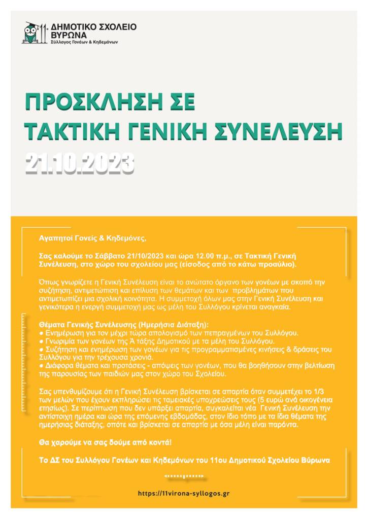 22/10/2023 HappySpot Πρόσκληση σε Τακτική Γενική Συνέλευση | Σάββατο 21/10/23 | Στο Σχολείο μας. ΚοινοποίησηTweet Στείλε ένα σύνδεσμο σε έναν φίλο(Ανοίγει σε νέο παράθυρο) Email Μου αρέσει! Φόρτωση...
