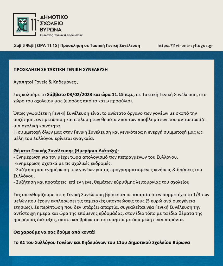 01/02/2024 HappySpot Σαβ 3 Φεβ | ΩΡΑ 11.15 | Πρόσκληση σε Τακτική Γενική Συνέλευση ΚοινοποίησηTweet Στείλε ένα σύνδεσμο σε έναν φίλο(Ανοίγει σε νέο παράθυρο) Email Μου αρέσει! Φόρτωση...