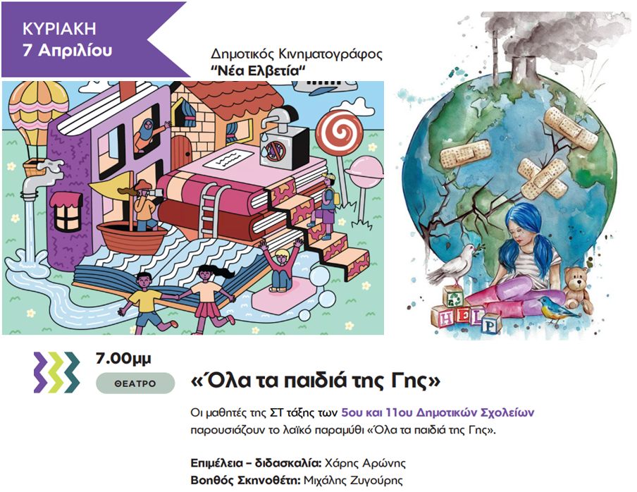 Στο πλαίσιο του «Παιδικού & Νεανικού Φεστιβάλ Δήμου Βύρωνα την Κυριακή 7 Απριλίου ώρα 7.00 μ.μ. , οι μαθήτριες και οι μαθητές της Στ΄ τάξης των 5ου και 11ου Δημοτικών Σχολείων Βύρωνα παρουσιάζουν το λαϊκό παραμύθι «Όλα τα παιδιά της Γης»