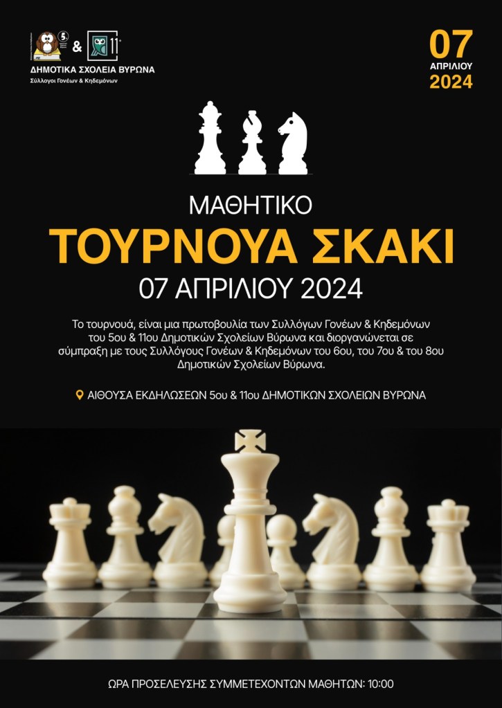 Την ΚΥΡΙΑΚΗ 7 ΑΠΡΙΛΙΟΥ και ώρα 10:30 στο χώρο των 5ου & 11ου Δημοτικών Σχολείων Βύρωνα, θα πραγματοποιηθεί ΤΟΥΡΝΟΥΑ ΣΚΑΚΙ για μαθητές Δημοτικού.