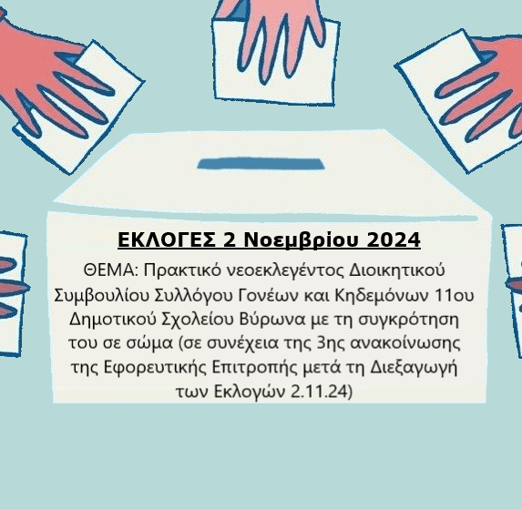 ΘΕΜΑ: Απόσπασμα Πρακτικού του νεοεκλεγέντος Διοικητικού Συμβουλίου Συλλόγου Γονέων και Κηδεμόνων 11ου Δημοτικού Σχολείου Βύρωνα με τη συγκρότηση του σε σώμα (σε συνέχεια της 3ης ανακοίνωσης της Εφορευτικής Επιτροπής μετά τη Διεξαγωγή των Εκλογών 2.11.24)