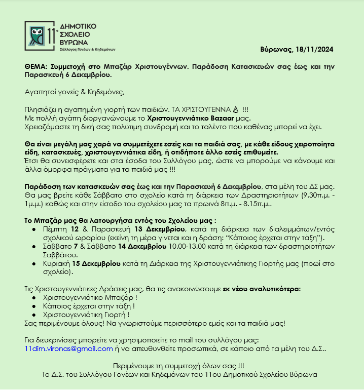 20/11/2024 HappySpot Δήλωση Συμμετοχής στο Μπαζάρ Χριστουγέννων έως και την Παρ 6 Δεκ Συμμετοχή στο Μπαζάρ Χριστουγέννων. Παράδοση Κατασκευών σας έως και την Παρασκευή 6 Δεκεμβρίου! ΚοινοποίησηTweet Στείλε ένα σύνδεσμο σε έναν φίλο(Ανοίγει σε νέο παράθυρο) Email Μου αρέσει! Φόρτωση...