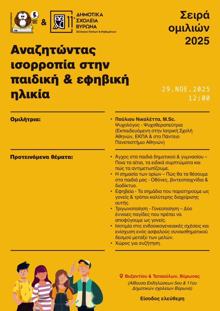 Το Σάββατο 29/11 στις 12:00 μ.μ. (αίθουσα εκδηλώσεων 5ου-11ου) για 2η χρονιά θα έχουμε τη χαρά να βρίσκεται κοντά μας η Νικολέττα Πούλιου Νικολέττα Πούλιου (MSc Ψυχολόγος – Ψυχοθεραπεύτρια – Γονέας 5ου Δημοτικού).